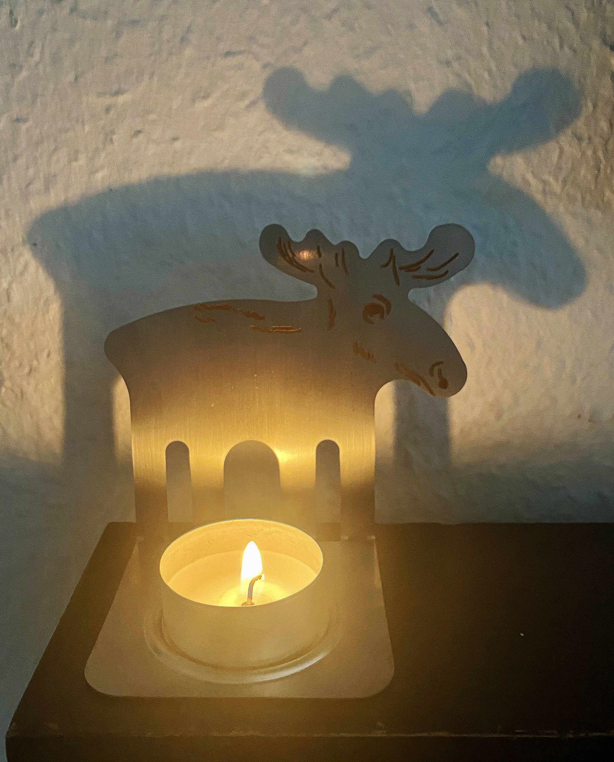 Der Elch-Teelichthalter wurde so gestaltet, dass Sie ihn in wenigen Schritten verwenden können: Der untere Teil, in dem das Teelicht steht, kann einfach im rechten Winkel umgebogen werden. Stellen Sie ein handelsübliches Teelicht oder ein LED-Teelicht in die vorgesehene Halterung – fertig! Positionieren Sie den Elch-Teelichthalter in der Nähe einer Wand, um ein eindrucksvolles Schattenspiel zu erleben: Der Elch wirft einen großen, bewegten Schatten, der wie ein kleines Kunstwerk wirkt. Achten Sie darauf, den Teelichthalter auf eine feuerfeste Unterlage zu stellen und das brennende Teelicht nie unbeaufsichtigt zu lassen. Wir wünschen Ihnen viel Freude mit diesem besonderen Produkt!