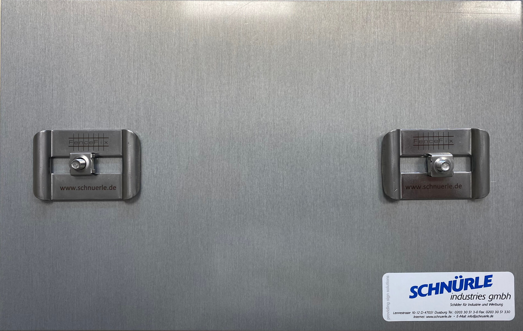 Das Halterungssystem besteht aus einer 65 × 40 × 1,5 mm starken Stahlplatte und wird komplett mit Käfigmutter und ULF-Schraube geliefert. Diese Kombination gewährleistet eine sichere und dauerhafte Verbindung zwischen Schild und Zaun.